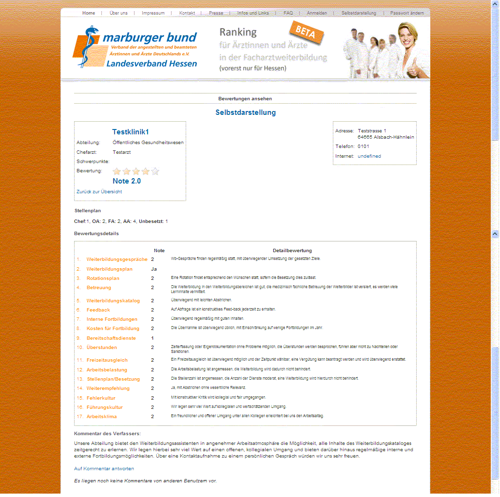 Als Abteilungsleiter haben Sie die Möglichkeit, Ihre Klinik oder Abteilung in einer Selbstdarstellung vorzustellen. Die Selbstdarstellung erfolgt zum einen durch Ausfüllen des Bewertungsfragebogens, bei dem eine Selbstbeurteilung stattfindet. Bei dem Fragebogen müssen nicht alle Fragen zwingen beantwortet werden. Zum anderen können Sie im Kommentarfeld ausführliche Informationen über Ihre Abteilung eintragen.